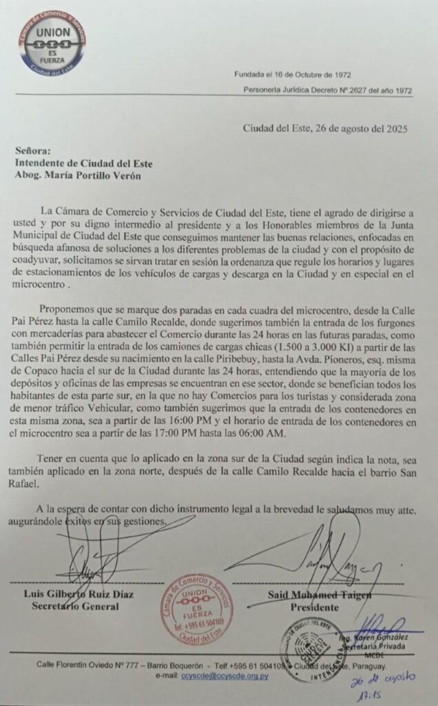 El pasado 26 de agosto, representantes de la Cámara de Comercio y Servicios de Ciudad del Este (CCYS-CDE) se reunieron con autoridades municipales, encabezadas por la Intendenta María Portillo, para coordinar acciones relacionadas al ordenamiento del microcentro y la planificación del Black Friday 2025. Participaron también el presidente de la Junta Municipal Sebastián Martínez y los concejales Oscar González, Víctor Torales y Pedro Acuña. En representación de la CCYS-CDE estuvieron presentes el presidente Said Taiyen, el secretario general Leonardo Díaz, el organizador del Black Friday Armando Ghazawi, el coordinador financiero Luis Gilberto Ruiz Díaz, y los miembros del consejo directivo Rubén Candia, Carlos Gamarra y Simón Benítez.